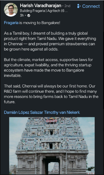 <p>Chennai-based agritech startup Fragaria is relocating its headquarters to Bengaluru, founder Harish Varadharajan revealed in a viral post on social media. </p>.<p>The decision, he said, was driven by a mix of factors, including climate, market access, startup-friendly policies, expat livability, and the strength of Bengaluru's thriving startup ecosystem.</p>.<p>“In Chennai, we gave it our all, building a global product and even cultivating strawberries against the odds. But the climate, supportive agricultural laws, and better startup opportunities in Bengaluru made this shift inevitable,” Varadharajan wrote.</p>.Mysuru Dasara: City of Palaces decked up for the 'D-Day'.<p>While the company’s research and development farm will remain in Chennai, the announcement has reignited debate on why Tamil Nadu, despite its talent pool and infrastructure, struggles to retain fast-growing startups.</p>.<p>Reactions online reflected a sharp divide. Some users questioned the climate reasoning, noting that Chennai experiences sea breezes for most of the year, with extreme heat largely confined to April and May. “Chennai already has talent and infrastructure. What’s missing is sustained startup support,” one user commented.</p>.<p>Others expressed frustration that Tamil Nadu’s investment in education and infrastructure is benefiting other states. “Yet another startup born here moves to Bengaluru. We train the talent, but Bengaluru reaps the rewards,” a professional lamented.</p>.<p>Supporters of the move pointed out that Bengaluru’s edge lies not only in livability but also in liberal policies encouraging innovation. “Even with traffic and high costs, Bengaluru still wins. Young talent wants to work where startups thrive, not just in factories,” one commentator argued.</p>.<p>Some suggested alternatives within Tamil Nadu, such as Coimbatore, which they believe could mirror Pune’s growth.</p>.<p>Varadharajan, however, emphasized that Chennai will remain Fragaria’s first home, with the R&D farm continuing operations there, leaving room for future initiatives in the state.</p>
