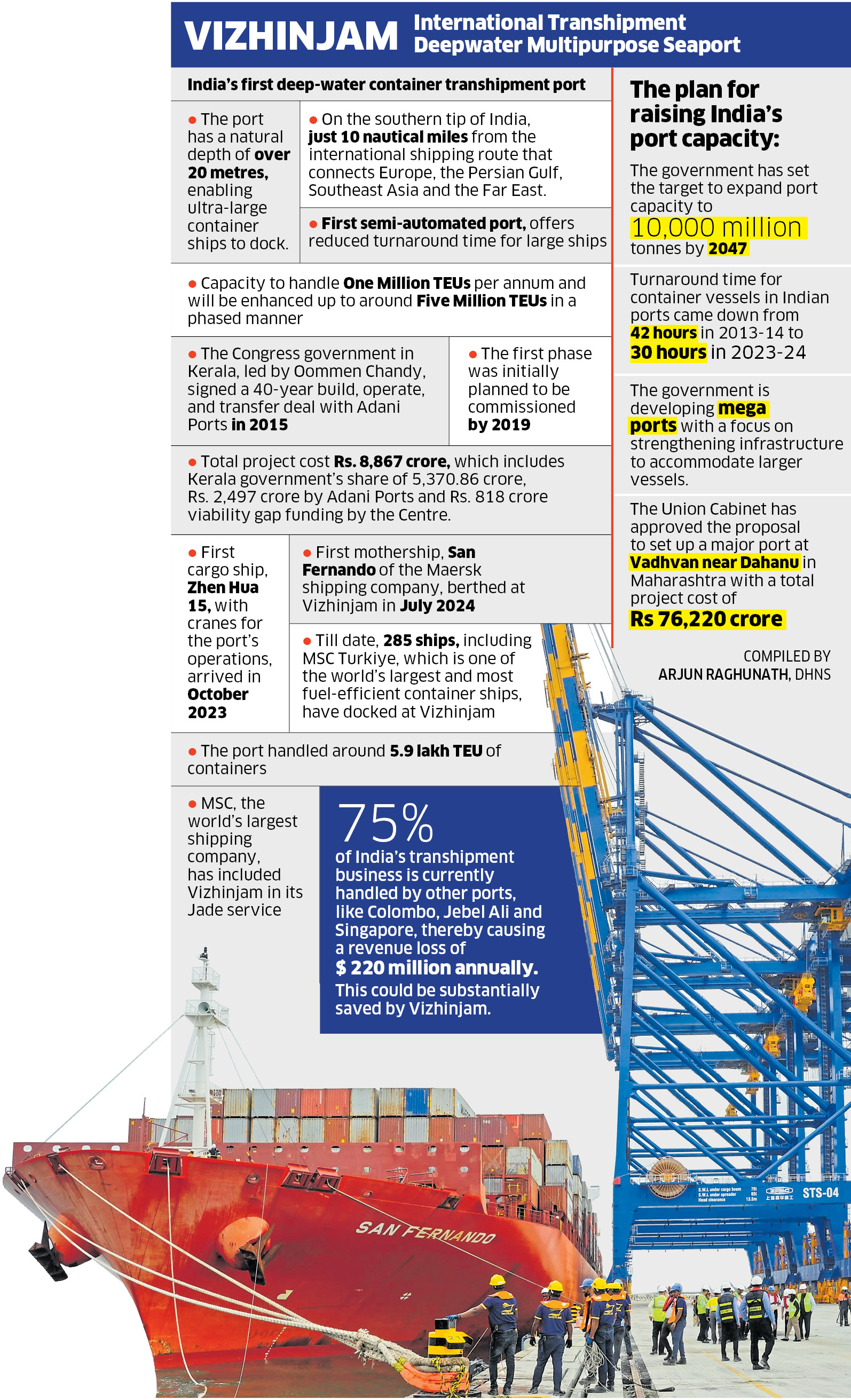 <p>India’s money will now serve India, Prime Minister Narendra Modi said, after dedicating the Vizhinjam International Deepwater Multipurpose Seaport to the nation on May 2.</p><p>Nearly 75 per cent of India’s transhipment operations are conducted at foreign ports, like the ones in Singapore, Colombo and Dubai, causing significant revenue loss for the country. The Rs 8800 crore new port in Thiruvananthapuram now promises to bring the business home. The money that once flowed outside will now generate new economic opportunities for Kerala and the rest of India, said Modi.</p><p>The Vizhinjam port on the southern coast of Kerala is just around 10 nautical miles (19 km) from the east-west shipping channel, a key international shipping route. The new port is billed as India’s first dedicated transhipment facility. Large ship containers can now directly dock at the Vizhinjam port, instead of berthing at ports like Singapore and Colombo and transferring goods to smaller vessels for onward transport to India.</p>. <p>It will significantly cut down India’s annual expenditure of around $220 million on using foreign ports for transhipment purposes. Transit time will also be reduced significantly.</p><p>Apart from the money and time, an important critical factor in international trade is geopolitical risks, which would also be significantly addressed by the new port.</p>.Vizhinjam Port: A leap towards making India a maritime hub.<p>Engineering Export Promotion Council of India (EEPC India) Chairman Pankaj Chadha said that the new facility would be of great help to exporters and importers and would pave the way to make India a transhipment hub.</p><p>“Currently, the transhipment hub is Colombo. The Vizhinjam port will help in getting the transhipment shifted from Colombo to Vizhinjam,” said Chadha.</p><p>Ports have been one of the key focus areas of infrastructure development in the past decade. India’s port capacity has doubled in the past 10 years.</p><p>Vizhinjam port has been developed at an estimated cost of Rs 8,867 crore under a public-private partnership with Adani Ports and SEZ Ltd. Its natural deep draft of nearly 20 meters and location near one of the world's busiest sea trade routes will help strengthen India’s position in global trade.</p><p>The bulk of India’s cargo is handled through 12 major ports located on both the eastern and western coasts of the country. The central government has invested significantly in upgrading existing ports and developing the new ones under ‘Sagarmala’. As per the Ministry of Ports, Shipping and Waterways, 839 projects worth Rs 5.79 lakh crore were taken up under the Sagarmala programme. Out of these, 272 projects with an investment of Rs 1.41 lakh crore have been completed. Major greenfield projects at different stages of development include Vadhavan Port and Murbe Port in Maharashtra, Keni Port in Karnataka, and Ramayapatnam Port and Machilipatnam Port in Andhra Pradesh.</p><p><strong>Long wait</strong></p><p>The proposal for the development of Vizhinjam port as a major one was initially mooted in the 1940s by the Diwan of the erstwhile Travancore state. After a gap of around five decades, the Vizhinjam port proposal again came up in the 1990s with the then ports minister M V Raghavan taking it up. In 2015, the Kerala government signed a deal with the Adani Group for the development of the port. Though the first phase was supposed to be made operational in four years, factors like the 2017 Ockhi cyclone, 2018 floods and the Covid-19 pandemic delayed the commissioning. The port was finally commissioned in December 2024.</p><p><strong>Advantage Kerala</strong></p><p>The immediate benefit for Kerala comes in the form of the development of logistics infrastructure and related facilities. Trivandrum Chamber of Commerce and Industry president S N Raghuchandran Nair expressed hope that Kerala would witness major leaps in development with the port becoming fully operational. Many private investors had shown keen interest in investing in the logistics sector. Proximity to the NH-16 is also a key advantage of the port. The transhipment activities of Vizhinjam will also benefit the nearby ports like the Kochi port, he said.</p><p>Dil Koshy, an exporter based in Thiruvananthapuram, said that many exporters from Kerala have started procuring products from neighbouring states like Tamil Nadu for export. Industrial units in the southern parts of Tamil Nadu, close to Kerala, are also likely to benefit from the Vizhinjam port, he said. </p>