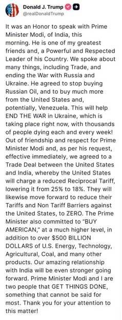 <p>US President Donald Trump on Monday announced that the reciprocal tariff on India will be lowered from 25% to 18%. </p><p>Trump said that he spoke to Prime Minister Narendra Modi over a range of topics including "trade, and ending the war with Russia and Ukraine." He said that Modi has "agreed to stop buying Russian Oil, and to buy much more from the United States and, potentially, Venezuela."</p><p>"Out of friendship and respect for Prime Minister Modi and, as per his request, effective immediately, we agreed to a Trade Deal between the United States and India, whereby the United States will charge a reduced Reciprocal Tariff, lowering it from 25% to 18%," he posted on Truth Social. </p>.Explained | What's next for Trump's Gaza plan after Rafah reopening?.<p>"India will likewise move forward to reduce their tariffs and non tariff barriers against the United States to zero," he added. </p>.<p>The announcement came after Trump spoke to Prime Minister Narendra Modi on Monday, apparently in an attempt to address the sharp downturn in the relations between the two countries.</p><p>US ambassador to India Sergio Gor confirmed the phone conversation in a brief social media post.</p>