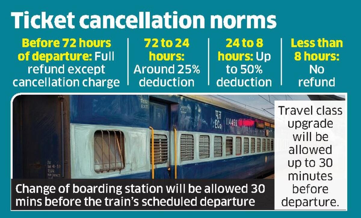 <p>Railway Minister <a href="https://www.deccanherald.com/tags/ashiwni-vaishnaw">Ashwini Vaishnaw</a> on Tuesday said that confirmed train tickets cancelled less than eight hours before departure will no longer be eligible for refunds.<br><br>The new refund rule, which intended to reduce last-minute cancellations and improve seat availability for other passengers, will come into force between April 1 and 15 this year, he told media persons here. <br><br>At present, no refund will be provided if the ticket is cancelled in less than four hour.<br><br>Other refund slabs have also been revised: a cancellation between 24 and eight hours will incur a 50 per cent deduction from the ticket cost. This is currently 12 to four hours.</p>.<p>Similarly, the Railways will deduct 25 per cent of the ticket cost for cancellation between 72 and 24 hours before departure.<br><br>A full refund -- except a flat cancellation charge per passenger -- will be given for cancellations made more than 72 hours before the train's departure.</p>.Railways announces new refund rules for cancellation of confirmed ticket.<p>Under the existing policy, cancellations made between 48 and 12 hours incur a 25 per cent deduction of the ticket cost, while a full refund will be given for cancellations made more than 48 hours in advance.<br><br>The new refund rule, which the railways minister announced for all trains on Tuesday, has already been in force on <a href="https://www.deccanherald.com/tags/vande-bharat">Vande Bharat</a> Sleeper and Amrit Bharat II trains launched after January this year.<br><br>The ministry first announced this through a notification dated January 16, 2026, which amended the Railway Passengers (Cancellation of Ticket and Refund of Fare) Rules, 2015.<br><br>Vaishnaw on Tuesday said travel class upgradation will now be allowed up to 30 minutes before departure for passengers who bought counter tickets. Earlier, passengers could upgrade travel class only before the train's first chart.<br><br>"The first chart is released at least eight hours before the train's departure, and the second one between 15 and 30 minutes. Passengers can now upgrade their travel class 30 minutes before the train's departure. This facility is available only for counter ticket holders; online ticket purchasers are not allowed class upgradation," said a railway official.<br><br>On a change of train boarding point, Vaishnaw said passengers will be given the freedom to change their boarding point 30 minutes before the train's scheduled departure.<br><br>Currently, a change of boarding point is allowed only before preparation of the first chart.<br><br>Explaining the reform, Vaishnaw said that if a passenger holds a confirmed ticket between station A and Z, and due to a sudden change in plan, he wants to change the boarding point from station A to B, with the new reform, the passenger will be able to digitally update his/her boarding point to B up to 30 minutes before the train leaves the origin station A.<br><br>The change of boarding point will have no impact on the ticket cost, an official said.<br><br>Vaishnaw said that to prevent agents and touts from hoarding tickets, various changes have been made to the Tatkal booking system, including Aadhaar-based OTP, booking restriction on agents for the first 30 minutes, and deployment of an anti-bot solution to filter non-genuine users.</p>.Train services hit for 1.5 hrs as man climbs electricity pole at Kalyan station; injured after fall.<p>He said 3 crore suspicious user IDs have been deactivated so far.<br><br>The railway minister also announced reforms in salt and auto transportation by introducing special containers with non-corrosive features and specialised wagons for auto carriers. The mechanised loading and unloading of salts will be done now for efficient handling, he said.<br><br><strong>Highlights :<br><br>New train confirmed ticket cancellation rules :</strong><br><br>Before 72 hours departure: Full refund except cancellation charge.<br><br>72 to 24 hours: Around 25% deduction.<br><br>24 to 8 hours: Up to 50% deduction<br><br>Less than 8 hours: No refund.<br><br><strong>Other changes :</strong><br><br>Travel class upgrade will be allowed up to 30 minutes before departure.<br><br>Change of boarding station will be allowed 30 minutes before the train's scheduled departure.<br></p>