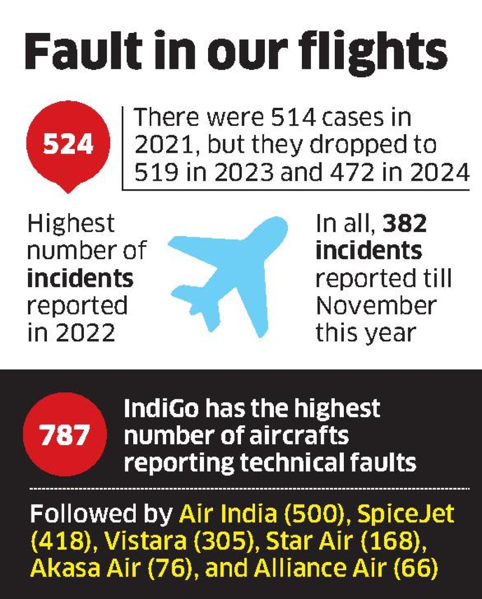 <p>New Delhi: Technical faults were detected in over 2,400 aircraft operated by eight commercial airlines in the past five years with 382 incidents reported this year till November, the least for a year during the period, the Ministry of Civil Aviation has said.</p><p>According to official statistics placed in Lok Sabha last Thursday, the highest number of 524 incidents were reported in 2022 and since then, such cases have shown a decline. In 2021, there were 514 cases while it declined to 519 in 2023 and 472 in 2024.</p><p>Between 2021 and 2024, there were seven airlines – Alliance Air, IndiGo, SpiceJet, Vistara, Air India, Air India Express, Akasa Air and Star Air – reported technical faults in their aircraft, while the number declined to six airlines this year after the merger of Vistara with Air India.</p>.<p>IndiGo has the highest number of 787 aircraft reporting technical faults followed by Air India (500), SpiceJet (418), Vistara (305), Star Air (168), Akasa Air (76) and Alliance Air (66), Minister of State for Civil Aviation Murlidhar Mohol said in a written reply.</p><p>The statistics showed that IndiGo and other airlines witnessed a lesser number of instances of aircraft developing technical faults over the years. While IndiGo saw 179, 215 and 246 cases in 2021, 2022 and 2023 respectively, it came down to 46 and 101 in the next two years.</p>.Man alleges assault by Air India Express pilot at Delhi airport; Airline removes him from official duties.<p>However, Air India, which saw a dramatic rise in the number of such cases in 2024 when it reported 253 cases from 76, 64 and 63 in 2021, 2022 and 2023 respectively. It came down to 44 this year. Akasa Air reported 60 of its 76 cases this year.</p><p>Mohol said the Directorate General of Civil Aviation (DGCA) monitors these defects by analysing Engineering Statistical Reports (ESR) and defect reports submitted by the airlines.</p><p>"All defects reported by airlines to DGCA are investigated to ensure appropriate rectification and to prevent recurrence. During the investigation, if it is found that the defect was caused by careless or casual attitude or due to willful negligence of technical personnel, DGCA takes enforcement action against the erring employees," he said.</p><p>Twelve such investigations have been completed and enforcement actions have been taken by DGCA in respect of violations by airlines. On seven occasions, he said, financial penalties have been imposed on the airlines.</p><p>He also said the DGCA has a structured surveillance and audit framework in place -- planned and unplanned surveillance of organisation and aircraft, which includes regular and periodic audits, spot checks, night surveillance and ramp inspections across all operators, including continuous oversight of maintenance practices. </p><p>In case there is a violation, he added, the DGCA takes enforcement action as per its Enforcement Policy and Procedure Manual.</p>