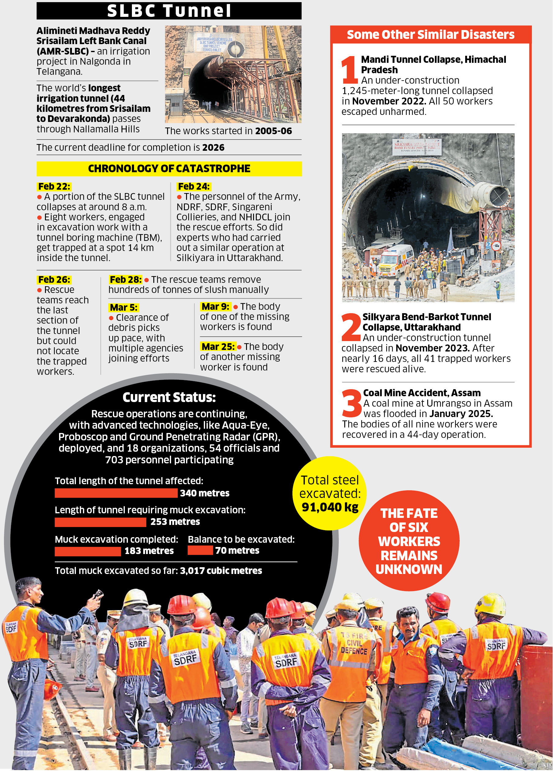 <p>When Anuj Sahu entered the SLBC tunnel in Telangana’s Nagarkurnool district early on February 22, he was just about a fortnight away from a much-awaited vacation. He had already reserved a seat on a train that would have taken him to his home in faraway Jharkhand on March 9. But the tunnel collapsed, and Anuj, 28, was trapped under a huge pile of sludge, concrete and metal. So were seven other workers, most of whom were engaged by the Jaiprakash Associates Limited (JAL), a private company based in Uttar Pradesh, to build the longest irrigation tunnel in the world.</p><p>The 40-kilometre SLBC tunnel, designed to supply irrigation and drinking water to Nalgonda and Nagarkurnool, turned into a labyrinth of rubble and twisted metals when approximately 25,000 tonnes of rock and silt collapsed at a point nearly 13.9 kilometres inside it. With water pouring in at a speed of 3500 litres per minute, the catastrophe shattered and buried a 1,500-tonne Tunnel Boring Machine (TBM) of the US-based Robbins Company. The body of its operator, Gurpreet Singh, was recovered on March 9, followed by that of Manoj Kumar, the JAL’s project engineer, who hailed from Unnao in Uttar Pradesh, on March 26. The fate of six other workers remains unknown.</p><p>The construction of the SLBC tunnel began in 2005-06. A 32-kilometre stretch of the tunnel was finished by the time Telangana was created in 2014. However, the previous BRS government ignored the SLBC tunnel project for 10 years, and the work resumed after the Congress came to power. The project was envisaged to provide irrigation facilities in drought-prone areas of Nalgonda and Nagarkurnool districts, apart from supplying drinking water to fluoride-affected villages.</p><p>The rescue operation, which was launched after the disaster struck the SLBC tunnel, is still on. But, with 50 days already gone, hope is diminishing, be it for the families of Anuj, Jagath Sahu, Santosh Sahu and Sandip Sahu in Jharkhand, or of Sri Niwas in Uttar Pradesh, or of Sunny Singh in Jammu and Kashmir</p><p>“It's one of the most challenging tasks we've faced,” Lotheti Sivasankar, a senior IAS officer and the nodal officer for the rescue operation, told <em>DH</em>. “The teams are confronting a huge concrete mound of approximately 308 metres inside the tunnel where the mishap occurred. This mound has solidified into rock embedded with metal and steel pieces from the shattered TBM.”</p>.'Construction companies should focus on disaster management, AI can help'.<p>The country’s longest-running rescue effort has already seen the mobilisation of extraordinary resources. The excavators and other machinery are running continuously while approximately 700 personnel work around the clock in three shifts. Specially trained cadaver dogs, Murphy and Maya, of Kerala Police, were flown in. They identified two potential locations, marked as 'D1' and 'D2', where workers might be trapped.</p><p>What makes the rescue operation particularly daunting is the tunnel's single entry and exit point. Irrigation Minister Capt. N. Uttam Kumar Reddy described it as “the most complicated and difficult rescue operation in the world, or at least in India”. The minister said that rescuers themselves face danger from continuous silt and water flow.</p><p>With the collapsed area nearly 400 meters below the surface, vertical excavation was ruled out. The rescue personnel have to navigate 14 kilometres through knee-deep water into the tunnel for almost an hour to reach the disaster site. A 200-meter stretch of the tunnel is completely blocked by debris. The heavy-duty motors run around the clock to dewater the tunnel.</p><p>“Work stopped long ago at the collapse site due to water leakage and seepage,” a survivor told <em>DH</em>. “They were applying chemicals. We believed the leak was under control, but we weren't prepared for such a major disaster.”</p><p>M Shyamprasad Reddy, a retired executive engineer who previously worked on the SLBC tunnel, said that the seepage might not have been handled properly. “The seepage was detected in 2019. Due to a lack of timely and proper action, it developed cavities and loosened the soil, causing huge, heavy boulders to fall on the workers,” Reddy, also president of the Telangana Retired Engineers Association, said. He urged the state government to appoint a committee with international experts to determine the cause and path forward.</p><p>For families of the trapped workers, the wait has become an agonizing limbo between hope and grief. Jeetu Sahu, father of missing worker Sandeep Sahu, traveled to Domalapenta after learning of the disaster. "I'm a farm labourer," he said. "My son left home last September. He studied until intermediate and was seeking steady work unavailable in our village. This was his first stable job," Jeetu told <em>DH.</em></p>.<p>Eleven national and state agencies have joined forces in this unprecedented rescue effort, including the Indian Army, Navy, Marcos Commandos, National Disaster Response Force, and technical experts from multiple organizations. Marine Commandos from the Indian Navy were brought in to assess options for navigating the final 40 metres where workers are believed to be trapped.</p><p>The scale of the challenge remains staggering as rescuers must remove approximately 10,000 cubic meters of mud sludge piled 10 feet high. The damaged TBM blocks their path, and the tunnel's narrow confines make it impossible for trucks to turn around inside. Each truck can carry only about 5 cubic meters of debris.</p><p> Despite these challenges, Sivasankar remains cautiously optimistic, hoping to clear the muck mound within the next 10-15 days and complete the operation.</p>