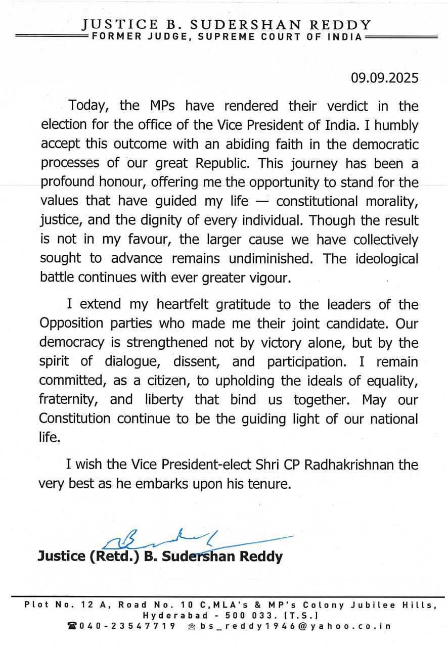 Ideological battle continues: Sudershan Reddy after CP Radhakrishnan's victory