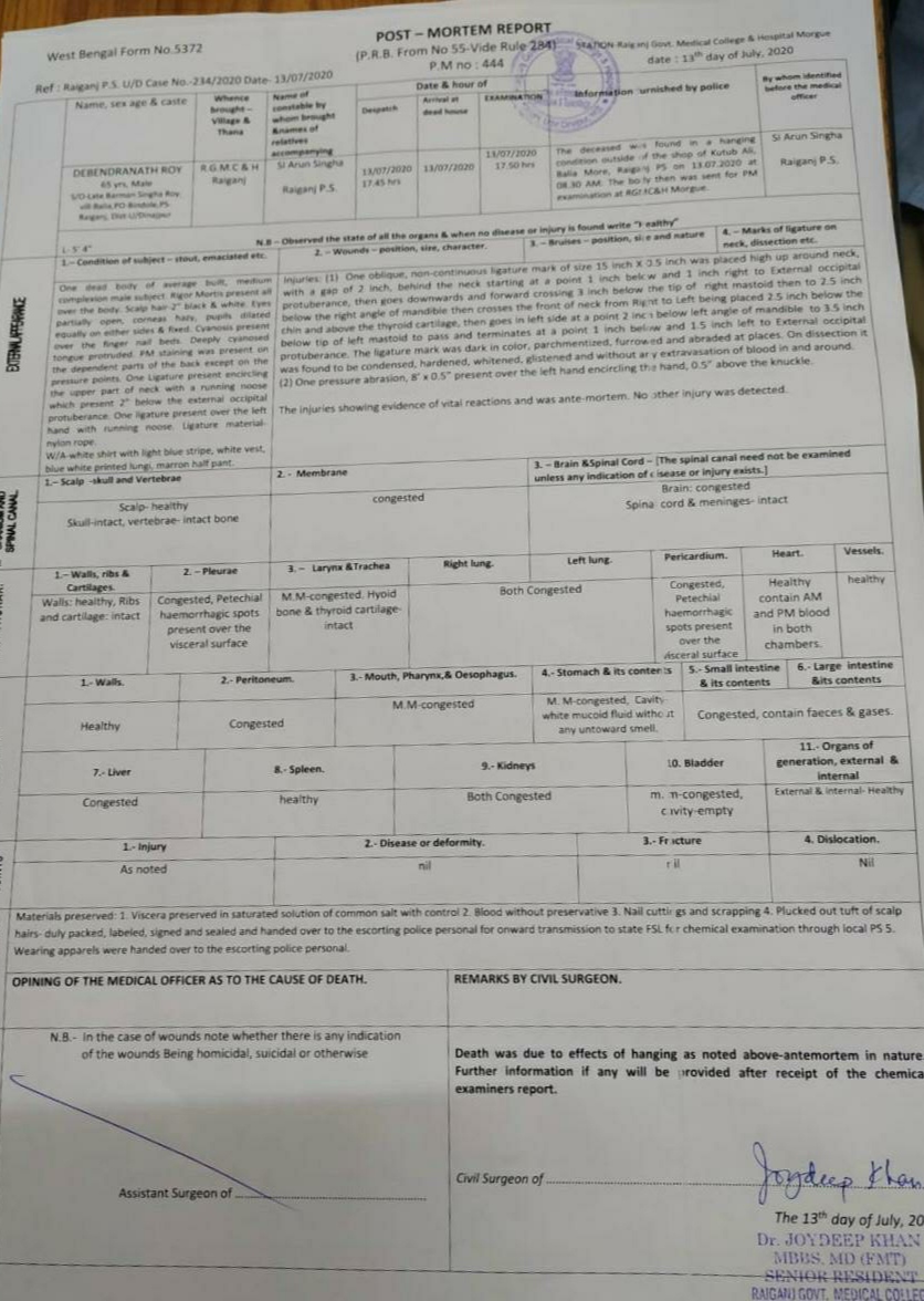 <p>The post-mortem report of the senior Bengal BJP leader and MLA Debendra Nath Roy released on Tuesday stated that he died due to hanging and apart from an injury mark on his left hand there were no other external injuries on his body. The development comes a day after Roy was found to be hanging at a mobile stall in his neighborhood.</p>.<p>“Death was due to the effects of hanging as noted above - antemortem in nature. Further information if any will be provided upon after receipt of the chemical examiner's report,” stated the post-mortem report.</p>.<p>Later in the day when the Home Secretary Alapon Bandyopadhyay said that after initial investigation the state police is primarily of the opinion that it was a case of suicide.</p>.<p>“Studying the post-mortem report, circumstantial evidence and after conducting initial investigation the state police primarily is of the opinion that the incident is probably a case of suicide,” said Bandyopadhyay.</p>.<p>He also said that the West Bengal government wants to make it clear that an impartial investigation will be conducted and no extraneous and political factor will be allowed to influence it.</p>.<p>“The West Bengal government wants to make it clear that through, impartial and transparent investigation will be conducted into the incident and no political and extraneous factor will hamper and influence the investigation,” said Bandyopadhyay.</p>.<p>Addressing media persons at the state Secretariat he said that a piece of paper was found in Roy’s pocket in which in he wrote the name and mobile numbers of two persons along with their photos.</p>.<p>“The deceased made some comments about the two ( in the note). State police is looking into all activities of the two.<br />During the day CID detained one person from Malda district in relation to the case. CID sources said that in initial interrogation he has denied any involvement in the incident.</p>.<p>Roy was elected from Hemtabad Assembly constituency in North Dinajpur district in 2016 on a CPI(M) ticket and joined BJP after the Lok Sabha elections but did not resign as an MLA.</p>