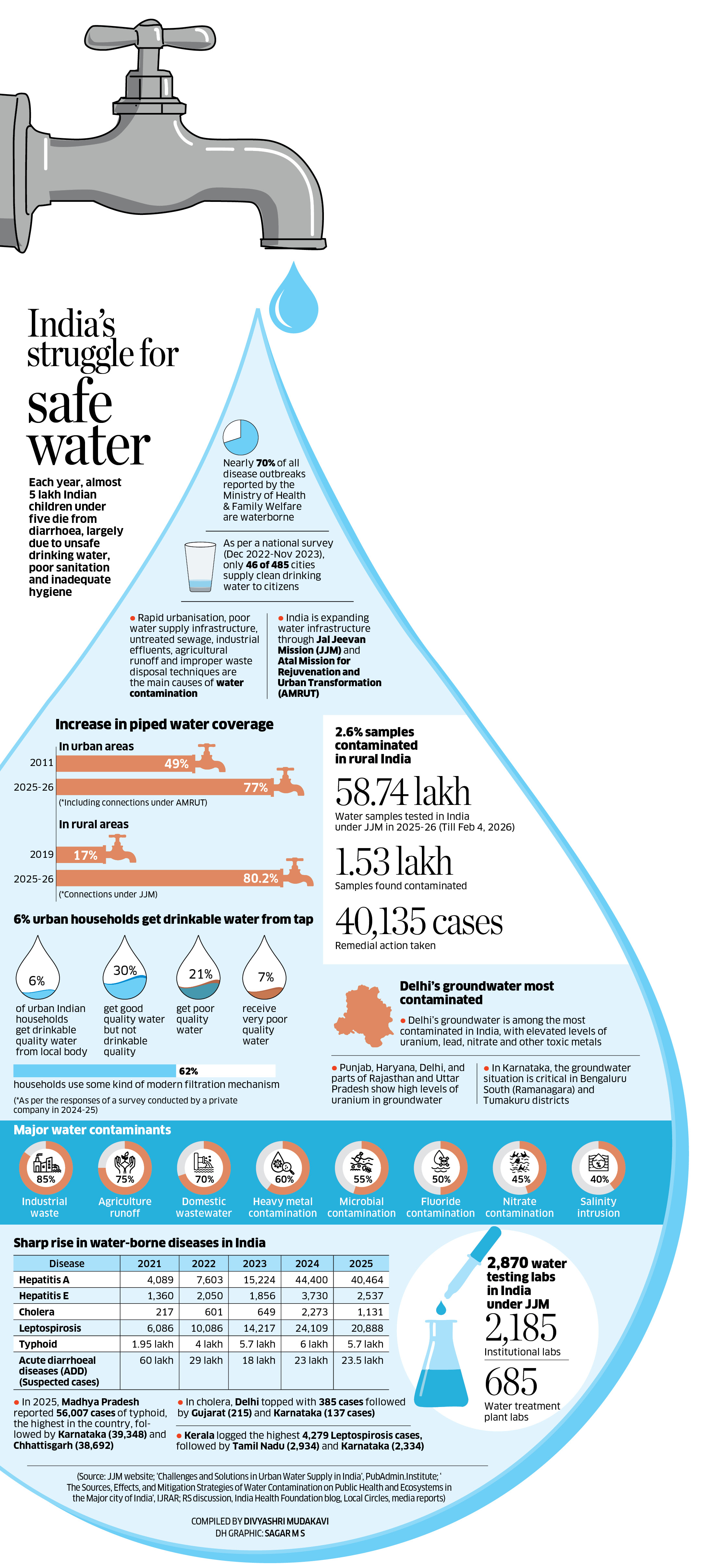 <p>After battling for survival for over a month, Anita Kushwah, 65, passed away last Sunday. First admitted to an Indore hospital on January 28 with severe vomiting and diarrhoea, Anita was initially discharged only to be readmitted in three days as her condition worsened. Reports said she later suffered a cardiac arrest, her kidneys failed, and even after being placed on a ventilator, she could not be saved. </p><p>Anita’s enemy was not a natural disaster or illness, but what flowed from the very taps that were meant to provide clean drinking water. With her death, the official toll in the Indore water contamination tragedy rose to 32. Ironically, it occurred in a city that has been consistently ranked the cleanest in India since the launch of Swachh Survekshan in 2016.</p><p>While residents estimated that around 3,000 people in the affected Bhagirathpura area suffered symptoms, with 450 requiring hospitalisation, the state government submitted in the Indore bench of Madhya Pradesh High Court that only 16 deaths could possibly be linked to the outbreak, a claim that the bench also questioned.</p><p>Lab tests confirmed the presence of E coli, Salmonella and Vibrio cholerae in the water supply. The source? A public toilet was built directly above a 30-year-old water pipeline, without a proper septic tank, allowing sewage to seep through leaking joints. Reports indicated that the residents of the densely populated neighbourhood had complained of foul-smelling, bitter-tasting, discoloured water since mid-December 2025, yet the supply continued.</p><p>The incident drew much-needed attention due to its severity and Indore’s ‘cleanest city’ tag, but it took a dismissive ‘ghanta’ remark by state cabinet Minister and six-time BJP legislator Kailash Vijayvargiya to catapult into national focus.</p><p>Indore’s tragedy is not an isolated incident. According to a report by Down to Earth published by the Centre for Science and Environment, from January 2025 to January 7, 2026, at least 34 people died and 5,500 people fell ill across 26 cities, including 16 state capitals, spanning 22 states and Union territories after consuming sewage-contaminated piped drinking water. </p>.GBA vs BDA: Bengaluru’s planning tug-of-war leaves city in limbo.<p>In Gujarat’s capital, Gandhinagar, contaminated drinking water led to a typhoid outbreak, with over 150 people, mostly children, falling ill, in early January. The National Human Rights Commission took suo motu cognisance of the outbreak and sought a report from the state authorities.</p><p>Officials determined that leakages in water and sewage pipelines at over two dozen locations may have caused the bacterial outbreak. According to officials, one contributing factor was the ongoing revamp of water and sewage lines, which were laid nearly three decades ago. </p><p>In Bengaluru’s Lingarajapuram, a tragedy was narrowly averted after residents complained about foul-smelling water, and the Bangalore Water Supply and Sewerage Board (BWSSB) promptly stopped the supply. A day later, using robotic technology, the agency identified the exact spot of contamination and replaced the affected pipeline. </p>.<p>The officials said that the pipeline was older than four decades and was giving way to corrosion. </p><p>In less than a month, similar reports emerged from the V S Garden area in Bengaluru’s Rayapuram, where residents said that they had been receiving sewage-contaminated water for nearly a week. BWSSB officials who inspected the pipelines reported that an illegal connection, which had cut into the pipeline without permission, had caused the contamination.</p><p>Beyond sewage contamination, drinking water in cities is sometimes marred by dangerous chemicals. Delhi relies heavily on the Yamuna River for about 40% of its water supply. However, the river is heavily polluted with industrial waste and high ammonia levels. This has repeatedly forced water treatment plants to shut down or operate at reduced capacity, with key facilities like Wazirabad and Chandrawal curtailing output by 25-50%, causing shortages that affect millions of residents. In January 2026, elevated ammonia levels rendered the water too toxic to treat, resulting in black, foul-smelling water in some areas and disruptions that lasted several days.</p><p>A 2025 report by the Central Ground Water Board (CGWB) found that in Delhi, 13-15% of groundwater samples contained uranium above safe limits (30 ppb), along with elevated levels of salinity, nitrates, fluoride and other heavy metals. A Comptroller and Auditor General of India (CAG) audit released in January also pointed out that nearly 55% of tested groundwater samples in Delhi were unsafe for consumption. </p><p>While such cases are often dismissed as civic issues, they affect the everyday lives of large populations. An estimate suggests that in developing countries, inadequate drinking water and sanitation facilities account for around 80% of all illnesses. </p><p>Access to water and sanitation is recognised by the United Nations as a human right – fundamental to everyone’s health, dignity and prosperity.</p><p>In the above-mentioned and several other reported and unreported cases, a similar pattern emerges — old leaking pipes, sewage contamination, poor planning and ignored complaints — pointing to systematic failures in how Indian cities often fail to deliver clean water, a basic amenity, to their citizens.</p><p><strong>The journey of water</strong></p><p>For almost all cities, the journey of water starts at treatment centres, where water is pumped from multiple sources, including rivers and lakes. At these centres, the water is mandated to be treated as per BIS 10500: 2012 drinking water quality standards.</p><p>Taking the example of water pumping in Bengaluru, M N Thippeswamy, retired chief engineer of BWSSB, explained, “At the treatment plant, we provide disinfection and keep residual chlorine at one milligram per li