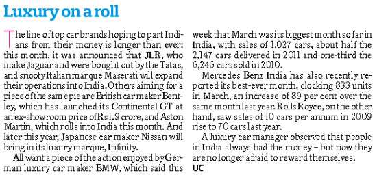 <p>Back in economics class in the eighties, we didn’t think we’d see real-life examples of Thorstein Veblen’s Theory of the Leisure Class here in India. The 19th-century economist’s seminal proposition postulated that the accumulation of wealth following the second industrial revolution resulted in a new social class, the nouveau riche.<br /><br />Pity we didn’t have a crystal ball. For not only can we now see this nouveau riche leapfrogging caste and class barriers all around us, but their impact is being felt as deeply as cut to the quick. As Veblen predicted, the results lie glittering in front of us, on the skyline, over the airwaves and in our supermarkets. Conspicuous consumption is here to stay.<br /><br />If you’ve got it, flaunt it, goes the new thinking – something that previous generations would never have felt comfortable doing. Let your imagination drift for one second: would Dhirubhai Ambani have built such a towering edifice to purchasing power as his son Mukesh has?<br /><br />A recent survey from luxury property company Knight Frank and the global financial firm Citigroup, which represents 5,000 clients worth more than $100 million each, found that Indians are the most likely to flaunt their newly-acquired wealth – outdoing even Russia’s oligarchs, who prefer to focus on charitable giving. The study found that 93 per cent of Indians are happy to spend on big-ticket items such as yachts and private jets.<br /><br />Everyone who can afford it is happy to flaunt their designer labels – whether clothes, accessories, holidays or even their very lifestyle. <br /><br />From across the length and breadth of the country come stories of high-powered spending – crores’ worth of furniture shopping in Bangalore is topped only by the sale of new cars in Delhi.<br /><br />And of course the brands are flocking to our shores. Only last week, British luxury sports car manufacturer Aston Martin announced its entry into India, bringing to our shores its most expensive model in the Rs 20 crore limited-edition two-door coupe ‘One77’ (Rs 25 crore if you add registration, insurance and local levies in a city like Mumbai).<br /><br /></p>.<p>Reliance Brands announced recently it plans to bring to India American shoe and accessories label Steve Madden, while it hopes to open four stores for Quiksilver, the American outdoor lifestyle brand, in 2011. Spanish designer label Adolfo Dominguez has recently launched in the capital and is already set to open two more stores in India’s key metros within its first year in partnership with Wadhawan Lifestyle Retail, which brought in the cult brands of Ed Hardy and Christian Audigier to the elite Indian consumers in 2007. On the fine dining front, London-based Michelin-starred chef Vineet Bhatia has opened two restaurants in Mumbai now, and is expected to launch one in Delhi. <br /><br />On the hotel front, several new chains want to make India their home. Dubai’s Emaar Hospitality is looking for partners to bring in its five-star hotel brand, The Address, with a first property projected for Delhi. MGM Hospitality, which also owns the Bellagio brand, has announced a luxury 480-room hotel for Gurgaon, and Starwood’s W Hotels has plans for a Mumbai property by 2015. <br /><br />“Indian consumers continue to enjoy double digit growth in per capita income and have a higher propensity to spend on travel and recreation,” said Vasant Prabhu, Vice Chairman and Chief Financial Officer for Starwood, which will open its 50th hotel in India next year, doubling its footprint in the country in a span of two years. <br /><br />“As domestic travel increases and Indian travellers continue to demand more sophistication in terms of both quality and experience, we have significant opportunity to grow our brands across the spectrum,” he adds.<br /><br />Even the Indian brands are going hell for leather. The Oberoi has just opened a new hotel in Gurgaon, which has been called the most luxurious city hotel in the country. It is also one of the best places to shop; it boasts a luxury retail arcade with 13 premium boutiques, an international salon and a contemporary Indian art gallery.<br /><br />Fashion designer Neeta Lulla hopes to capitalise on this newfound appetite. She says she wants to open eight to ten exclusive brand outlets around India in the coming months. These will not showcase her pret line, but will focus on higher-end ranges.<br /><br />Genesis Luxury Fashion, which distributes global brands such as Canali and Jimmy Choo, expects to open 35 new stores across India. Its Managing Director, Sanjay Kapoor, believes the right approach to the Indian luxury market is to be aggressive.<br /><br /> “Can you make money in luxury in India? I hope so,” he told AFP. “That’s why we are all here.”<br /><br />Everywhere you turn, it seems, there’s a new brand that could formerly only be bought when abroad – or a new arm of an old familiar.<br /><br /></p>.<p>Much of this comes down to skyrocketing growth and income levels. Shining India is a reality. The GDP growth rate over the last two years has been around seven per cent, with 2011 expected to do even better. <br /><br />As a result, we’ve gotten richer than ever. India now accounts for a record number of 554 billionaires on the Forbes 2011 list, with seven in the top 100. Their combined wealth is $246.5 billion, much higher than last year’s total of $222.1 billion – and more than the combined GDPs of Pakistan and Sri Lanka.<br /><br />And consulting firm McKinsey & Co expects young people to be at the centre of the luxury-buying trend. Forty million households or 200 million people that can afford branded lifestyle products will double over the next decade to 94 million households, it says. <br /><br />“Indian consumers really care about brands. Almost 22 per cent of Indian consumers try foreign products and brands,” McKinsey Director Laxman Narasimhan said.<br /