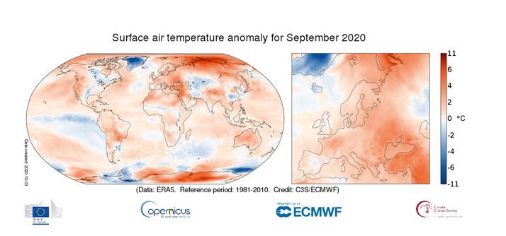 <p><em>By Todd Gillespie</em></p>.<p>Climate scientists warned 2020 could be the world’s hottest year on record, with September temperatures eclipsing previous highs and Arctic ice retreating from the seas it usually covers.</p>.<p>Global year-to-date temperatures show little deviation from 2016, the warmest calendar year recorded so far, Europe’s Copernicus Climate Change Service reported on Wednesday. Climate patterns like La Niña in the Pacific Ocean, occurring for the first time in eight years, could determine whether this year turns out to be the warmest on record, according to the researchers.</p>.<p>In September, temperatures reached 0.63 degrees Celsius (1.15 degrees Fahrenheit) above the 30-year historical average, with the Siberian Arctic and southeastern Europe in particular feeling the warming effects of climate change. Arctic sea ice reached its second-lowest extent for September, continuing a fast decline since satellites started monitoring the ice in 1979.</p>.<p>“There was an unusually rapid decline in Arctic sea ice extent during June and July, in the same region where above average temperatures were recorded,” Copernicus Director Carlo Buontempo said. “The combination of record temperatures and low Arctic sea ice in 2020 highlight the importance of improved and more comprehensive monitoring in a region warming faster than anywhere else in the world.”</p>.<p>This year’s record temperatures included an August reading of 54.4 Celsius (129.9 Fahrenheit) in Death Valley, possibly the highest ever recorded on earth. Wildfires have also ravaged Australia and western parts of the U.S., including California, where land burned has passed a record 4 million acres, the state’s fire department said on Sunday.</p>