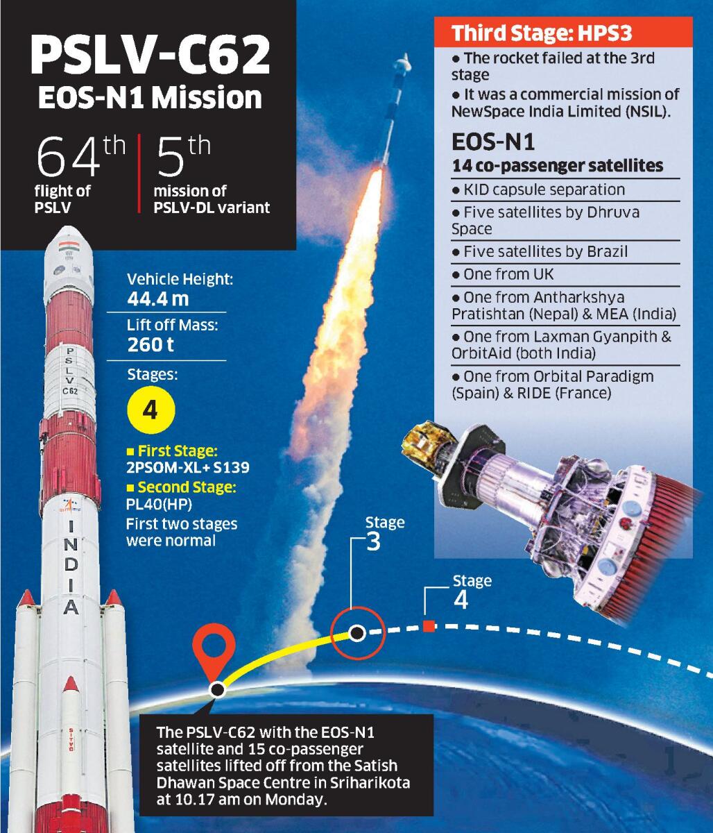 <p>Chennai: In the first mission in 2026, the Indian Space Research Organisation (<a href="https://www.deccanherald.com/tags/isro">ISRO</a>) on Monday successfully launched earth observation satellite, EOS-N1, and 15 co-passenger satellites from the Satish Dhawan Space Centre (SDSC) in Sriharikota near here. </p><p>PSLV-C62, the ninth dedicated commercial mission undertaken by NewSpace India Limited (NSIL), took off from the first launchpad of the SDSC at 10.17 am. The mission is also a boost to the burgeoning private space sector in the country with Hyderabad-based Dhruva Space, alone contributing five satellites. Indian companies Laxman Gyanpith and OrbitAid have one satellite each. </p>.ISRO rocket lifts off with EOS-N1: Five facts to know about DRDO's spy satellite .<p>Of the remaining eight, five are from Brazil’s AltoSpace, one each satellite from UK’s SSTL, one from Antharkshya Pratishtan of Nepal and the Ministry of External Affairs, India, and Orbital Paradigm (Spain) and RIDE (France). </p><p>The launch used the PSLV-DL variant with two solid strap-on motors and</p><p>the mission demonstrated KID or Kestrel Initial Technology Demonstrator from a Spanish startup, which is a small-scale prototype of a re-entry vehicle being developed by the startup. </p><p>“The KID will be the last co-passenger to be injected, after which it is slated to re-enter the earth’s atmosphere towards splashdown in the South Pacific Ocean,” the ISRO said. </p> .<p>PSLV is the workhorse launch vehicle of ISRO that has completed 63 flights including notable missions like Chandrayaan-1, Mars Orbiter Mission, Aditya-L1 and Astrosat Mission. In 2017, PSLV set a world record by launching 104 satellites in a single mission.</p><p>After injection of EOS-N1 and 14 satellites, PS4 stage will be re-started to de-boost and enter a re-entry trajectory, followed by KID Capsule separation. Both PS4 stage and KID capsule will re-enter into Earth’s Atmosphere and impact will be in the South Pacific Ocean. </p><p>Developed by Defence Research and Development Organisation (DRDO), the EOS-1 or Anvesha satellite is designed to provide cutting-edge imaging capabilities, enabling India to map enemy positions with pinpoint accuracy.</p>