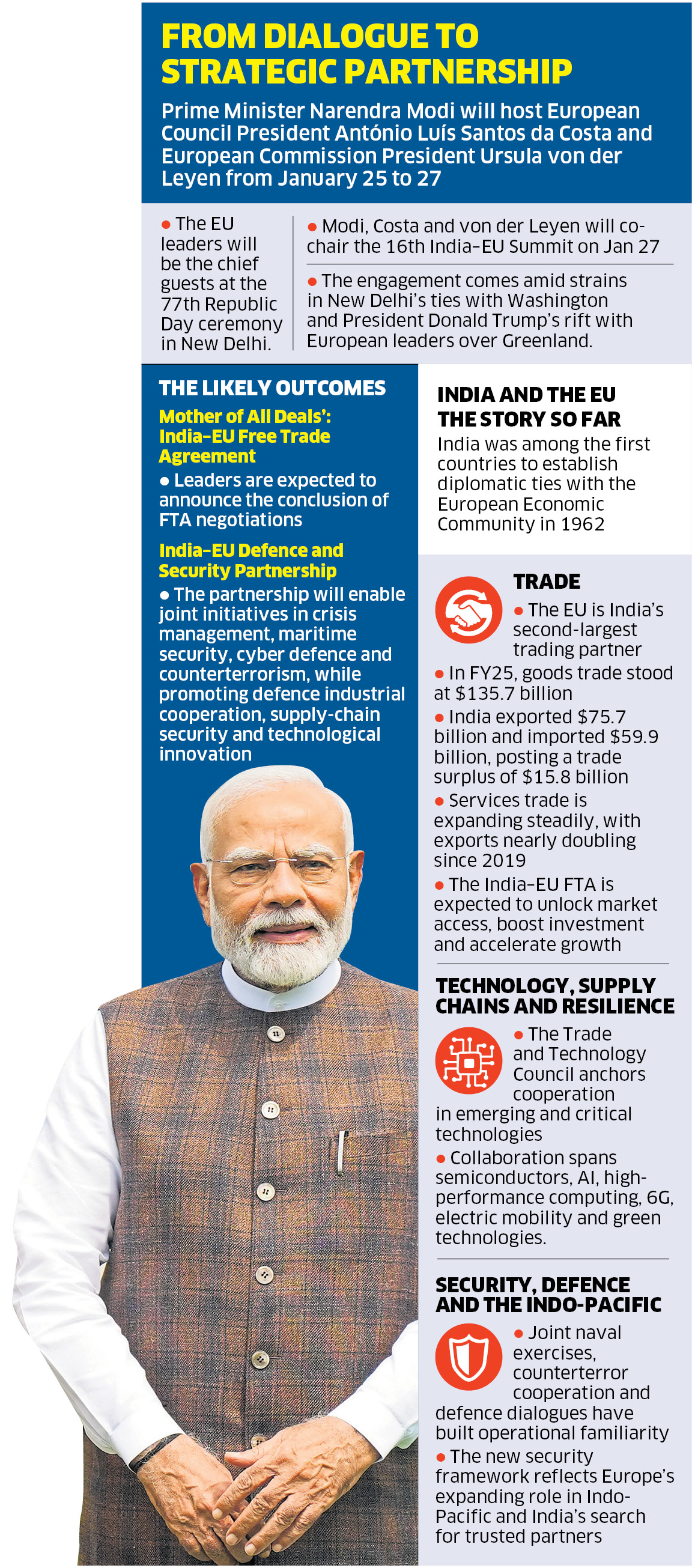 <p>India and the European Union are on the cusp of a historic realignment based on strategic interests and shared values. The inflection point benefits from the conclusion of the Broad-based Trade and Investment Agreement (BTIA) and collaboration in future-oriented areas such as technology, energy, sustainability, defence, space, and mobility. BTIA will have a profound influence on trade and investment, economic activity and regulatory framework, while strategic cooperation will balance geopolitics and geoeconomics.</p><p>India and the EU had established summit-level interaction in 2000, and relations were upgraded to a strategic partnership in 2004. Despite a high-level understanding, progress on the EU track lagged behind India's close bilateral ties with major European powers.</p><p><strong>Lengthy negotiations</strong></p><p>Negotiations for BTIA, launched in 2007, had slow progress and were paused in 2014. The EU had prioritised investments in the faster-growing Chinese market and championed WTO provisions expanding trade defence. India’s relatively small GDP and trade share, at that time, limited its leverage. But much had changed by 2021, when negotiations resumed, and the two sides saw benefit in meeting halfway for consensus on difficult issues. Political will for BTIA, supported by industry’s need for resilient supply chains, pushed for a new framework. Externally, China’s economic coercion, supply chain disruptions and acquisition of strategic assets had dimmed its lure. In contrast, India’s growth story was compelling and could not be ignored. Distress in the multilateral system and an ineffective WTO led India and the EU to negotiate several bilateral FTAs. Shifting geopolitics and geoeconomics demanded a robust partnership between India, the largest democracy and emerging power and EU, the bastion of high technology, regulatory framework and capital. Last year’s developments jolted strategic balance and multilateralism, hastening the India-EU consensus that was underway.</p><p><strong>Strategic orientation</strong></p><p>The state visit of European Council President António Luís Santos da Costa and European Commission President Ursula von der Leyen will set the stage for agreements on key components of the strategic partnership.</p><p><strong>Economic coordination</strong></p>.<p>The BTIA platform can help India’s market access aspirations, although the EU’s regulatory framework will be challenging. Indian exporters will need to diversify and upgrade quality, but the industry is confident it will stimulate the revival of manufacturing, especially MSMEs, and prepare them for global competition. Moreover, as investments and technology usually follow trade, there would be new opportunities to develop niche specialisation and scale economies for global presence in diversified supply chain partnerships.</p><p><strong>Knowledge sector engagement</strong></p>.India–EU FTA: India’s biggest trade bet yet.<p>Digital economy, technology and skill mobility are today’s vectors of development. Trust and confidence will facilitate AI, cyber and semiconductor R&D, establish technology hubs and innovation bridges, mobility of professionals, expansion of GCCs, etc. EU’s open strategic autonomy in tech, health and energy can align with India’s skills and scale for resilient and autonomous partnerships.</p><p><strong>Political understanding</strong></p><p>Expanding India-EU convergence on values such as democracy, human rights and sustainability will benefit from consultation and coordination. This can reduce frictions and revive the rules-based order, multilateralism and multipolarity. It can also address differing perceptions on issues such as Ukraine-Russia, terrorism and climate change.</p>.<p><strong>Strategic cooperation</strong></p><p>Growing trust and reliability have opened possibilities in strategic areas such as defence cooperation, military industry, critical technologies and critical materials, space, energy, etc. EU’s engagement in the Indo-Pacific, support to the India-Middle East-Europe-Economic Corridor and third country initiatives in Africa are indicative of the strategic approach. A community of 2 billion people contributing a quarter of global GDP is both an opportunity and a responsibility. India and the EU are ready to play their due roles in global governance to shape the new world order.</p><p>It is evident that India-EU relations fell short of their potential, and there is recognition for its careful nurturing. Today, we are poised to transition from a trade-centric relationship to a geopolitical-geoeconomic partnership. In the emerging multipolar order, both India and EU will play key roles with their own approaches to strategic autonomy.</p><p><em>(The writer is a former diplomat and currently a professor at Jindal Global University)</em></p>