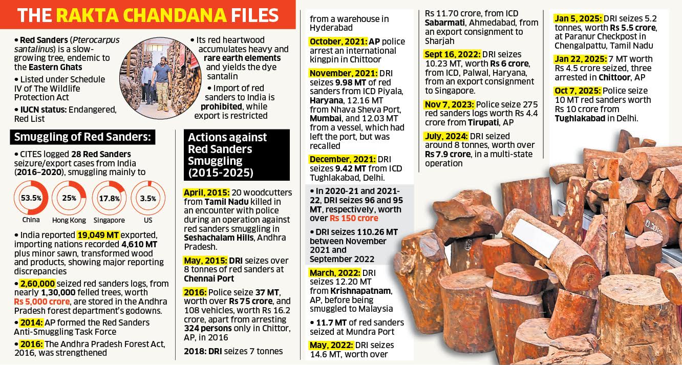 <p>In the rocky Seshachalam Hills near Tirupati in Andhra Pradesh grows a tree found nowhere else in the world – red sanders, locally known as Rakta Chandanam or Yerra Chandanam. The sunlight makes its deep red wood glow, and ancient lore claims its colour comes from the blood of Lord Sri Venkateswara, making it sacred to many. </p><p>During a recent visit to Tirupati, Andhra Pradesh Deputy Chief Minister Pawan Kalyan invoked the legend, stressing the spiritual significance and the protection of red sanders, which found itself at the centre of a multi-billion-dollar global smuggling industry.</p><p>The story of red sanders intertwines the story of spirituality, culture, and crime. The Tollywood film series, Pushpa, inspired by the smuggling trade, earned around Rs 2,000 crore worldwide. But, beyond cinematic glamour, lies a harsh reality of forests being systematically plundered to supply the international clients willing to pay extraordinary sums for this rare timber. </p><p>Native to the five Andhra Pradesh districts of Chittoor, Kadapa, Kurnool, Nellore, and Prakasam, the species is also cultivated in government and private plantations across Karnataka, Tamil Nadu, Telangana, and Kerala. Red sanders came under the spotlight in the 1960s when Japanese instrument makers discovered its exceptional qualities for crafting the shamisen. Chinese furniture makers later embraced the wood for premium luxury pieces, elevating it to one of China’s most sought-after timbers. Rising incomes in East Asia raised the demand sharply, transforming the tree into a global commodity. It is now also used in decorative art in the Middle East and in making handcrafted artefacts in the United States. </p><p>The red sanders smugglers have built an intricate global web. According to TRAFFIC, an international wildlife trade monitoring network, red sanders is illegally moved from India into China and Japan through Manipur and Mizoram, and neighbouring Myanmar, as well as through Uttar Pradesh and Bihar and neighbouring Nepal. Some consignments travel by sea to Malaysia and Singapore, while others move westward through Mumbai and Mundra ports to the UAE. The Wildlife Crime Control Bureau has identified additional routes through Sri Lanka and the Middle East. Several Chinese nationals have been arrested carrying smaller quantities through Chennai and Cochin airports. </p>.A people-powered programme to save red sanders.<p>While legal use of the wood includes making furniture, instruments, and dyes, the rumours of special industrial applications persist. “Some reports claim red sanders extracts might absorb nuclear radiation, though scientific proof is absent,” a Tirupati-based ecologist told DH. “Yet arrests linked to this belief suggest some buyers attribute unique properties to it.”</p><p>Despite growing awareness, officials admit the full scale of the trade remains poorly understood, with little reliable data on final destinations or value appreciation across its seven-layer illegal supply chain – from coolies who fell the trees to international smugglers at the top. </p><p>In the black market, red sanders fetch enormous sums. International prices range from Rs 50 lakh to over Rs 2 crore per tonne, depending on quality, while domestic black-market rates hover between Rs 15 lakh and Rs 30 lakh. </p><p>The violence associated with the trade has often proved deadly. On April 7, 2015, as many as 20 alleged woodcutters hired by smugglers were killed in near-simultaneous encounters in the Seshachalam forests. Police said the men attacked them with stones and sickles, forcing them to open fire in self-defence. </p><p>To curb escalating smuggling, the Andhra Pradesh government set up the Red Sanders Anti-Smuggling Task Force (RSASTF) in February 2015. With eight active teams based in Tirupati, Railway Koduru, Kadapa, and Sanipai, the task force is now preparing an action plan modelled on anti-Naxal operations. “We are working on a blueprint,” RSASTF Superintendent of Police P. Srinivas told DH. “Once approvals come, we will launch the operation.” </p><p>This year, the task force registered around 54 cases and arrested roughly 229 people, booking six under the Preventive Detention Act for the first time. Srinivas noted minimal local involvement, with smugglers bringing in labourers from Tamil Nadu to work deep inside forests.</p>