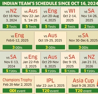 <p>Bengaluru: There has been a growing chorus among elite tennis players, across both genders, against an increasingly packed schedule. Top names such as six-time Grand Slam winner Carlos Alcaraz and six-time major champion Iga Swiatek have openly criticised the gruelling calendar, even pulling out of high-profile tournaments to protect their well-being.</p>.<p>Since tennis is an individual sport, it might seem players can simply choose their events. However, the ATP and WTA make that difficult. To ensure top players’ participation — vital for sponsorship and viewership — the ranking system forces players to compete in numerous tournaments to retain points that expire after 52 weeks. The result: even the best find themselves caught in a relentless cycle, warning that the pressure is damaging both mental and physical health.</p>.<p>A similar scenario unfolds in cricket. Top male cricketers spend nearly the entire year travelling, playing, packing, and flying from one city or continent to another. The pace is unsustainable and has created not only player fatigue but also spectator fatigue.</p>.<p>The growing popularity of T20 has further complicated the situation. For many nations lacking resources to sustain Test or ODI formats, the shortest version has become a lifeline. It’s fast, entertaining, and financially rewarding, drawing a new generation of players who see cricket as a viable full-time career.</p>.A delight to watch Rohit Sharma and Virat Kohli in a near-perfect game: Shubman Gill.<p>There is another set of players, and there are fewer of them than fingers can count, which, for various reasons, is restricted to the traditional format which is well-rewarding. </p>.<p>The third and most valuable tier consists of multi-format players who can adapt across styles. These athletes are indispensable: they fill stadiums, attract sponsors, and drive broadcast ratings. Taking just the Indian team into account, if it were the likes of Virat Kohli and Rohit Sharma in the immediate past, Shubman Gill, Yashasvi Jaiswal, Rishabh Pant, among others, are fast joining that club. The rewards, of course, are commensurate -- franchise deals, brand endorsements and lucrative central contracts from the BCCI. But this success comes at a price. As the backbone of India’s teams across formats, they play almost continuously throughout the year.</p>.<p>To get a sense of this madness, let’s glance at India Test and ODI skipper Gill’s workload in the last one year or so. Taking from the three-Test series at home against New Zealand from October 16, Gill has been playing non-stop in multiple formats. After three Tests against the Kiwis on November 3, he immediately flew to Australia for the five-Test series (Nov 22-Jan 5, skipped the first Test in Perth due to injury). This followed a healthy gap of one month before a deluge of events came in, starting with three ODIs against England (Feb 6-12). Soon after, he went to the UAE for the Champions Trophy (Feb 20-Mar 2). Immediately after his return, he was preparing and leading Gujarat Titans in IPL-18 (Mar 22 to end of May). From Jun 20-Aug 4, he was leading India in the away five-Test series against England. He had another long break before events followed and will continue to at a break-body speed. </p>.<p>This stretch began with the Asia Cup (Sept 9-28) and has lasted more than two months with little break in between. Two days after landing in India from Dubai, the two-Test series against West Indies commenced (Oct 2-14), four days later he was playing the first of three ODIs in Australia. After a three-day break, five-match T20I series started, ending Saturday (Nov 8). Five days later, he would be leading India in the two-Test series against South Africa (Nov 14-26 in Kolkata and Guwahati). Following this, if he isn’t rested, he would be captaining the side in the three ODIs (Nov 30-Dec 6) and playing the five T20Is (Dec 9-19) against the same opponents. </p>.MS Dhoni to play in IPL 2026: CSK CEO Kasi Viswanathan confirms Thala's return.<p>It’s exhausting even to read, imagine playing through it! Each match demands hours of practice in the nets and gym sessions, leaving little recovery time. Gill’s youth and fitness may help him for now, but such a schedule can break even the fittest athletes mentally and physically. Even Virat Kohli, once the epitome of stamina and focus, admitted to burnout despite his unmatched fitness regimen.</p>.<p>The team’s policy of managing workload solved only a part of the problem, and a holistic approach is needed to address players’ overall wellbeing. </p>.<p>What has also added to the workload is the streamlining of ICC events in all three formats. The biennial World Test Championship, the quadrennial ODI World Cup and the Champions Trophy and the biennial T20 World Cup. Unlike in the past, teams prepare more professionally for each of the white-ball tournament cycle by lining up a number bilateral series, making it difficult for players to skip these matches for the fear of ceding place to another aspirant.</p>.<p>Also, India, being India, are in demand across continents. They are cricket’s cash cow and everyone wants a piece of them. To maintain their heft in international cricket, the BCCI sends Indian teams to countries like Zimbabwe and Sri Lanka to keep them floating. A “compulsion”, neither England nor Australia are burdened with.</p>.<p>Australia visited West Indies earlier this year after a gap of 10 years. In the intervening period, India travelled to the Caribbean three times. England haven’t set foot in Zimbabwe after the 1996-97 Test series while Australia last played the Africans away in 1999. Of course, one can point out India not playing Pakistan in a bilateral series since 2012, but they more than compensate for it.</p>.<p>In the bargain, it’s the Indian cricketers are burdened with more than their counterparts in England or Australia. Yes, no player is complaining even when he