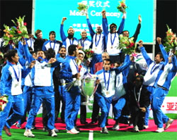 <p>The high-voltage summit clash was marred by Pakistan coach's unwarranted action of constantly abusing Indian players from the roof of the stadium. Whenever there was an infringement from the Indian side, he used the 'F' word liberally. And whenever the umpires blew against India, he hollered 'Thank You'.<br /><br />Rajpal Singh, Danish Mujtaba, Yuvraj Walmiki and Sarvanjit Singh scored for India in the penalty shootout while Muhammad Rizwan and Waseem Ahmed sounded the board for Pakistan after both the sides were locked goalless in the normal and extra time.<br /><br />India started the shootout on a wrong note when Pakistan goalkeeper Imran Shah saved the shot from Gurwinder Singh Chandi. Sreejesh then came to the fore with a save off Haseem Abdul Khan. It was then Mujtaba's turn and he neatly sent the ball past Shah to give India 1-0 lead.<br /><br />Pakistan equalised when Rizwan scored but Indian captain Rajpal slotted the ball home to give his side 2-1 up. Then came the crucial save by Sreejesh as he stopped Shafqat Rasool from scoring, advancing and taking the shot on the pads.<br /><br />Yuvraj made it 3-1 and the Pakistan veteran Waseem cut the scores to 3-2 but Sarvanjit's conversion past Shah ensured India ran out champions. <br /><br />Earlier in the match, both India and Pakistan had ample opportunities to finish off the match in regulation time. Pakistan earned seven penalty corners to India's one but they failed to beat the Indian defence and the goalkeeper Sreejesh.<br /><br />Asian Games champions Pakistan were initially more attacking pushing the Indian defence back. Shakeel Abassi made some fine runs into the Indian striking circle but V Raghunath stood out with his tackling and clearances.<br /><br />The Indian forwards had a couple of counter-attacks which the Pakistan defence managed to clear. It was a tense match with a few skirmishes between the players. SV Sunil was the first to be shown the green card for a rough tackle.<br /><br />Pakistan had their first penalty corner in the 14th minute which Sreejesh charged out and saved. India was losing the ball consistently in the midfield. The players were hasty and failed to keep the ball to ensure the passes went right.<br /><br />In the 29th minute, India had their first penalty corner but Ignace Tirkey failed to trap properly and thus wasting the opportunity.<br /><br />Pakistan had a bunch of penalty corners in the second half and they were to blame themselves for letting the match drift to the shoot-out. They could not score off the 41st, 47th and 48th minute penalty corners.</p>.<p>With 14 minutes of regulation time left, India got a golden chance with Mujtaba having only Pakistan goalkeeper in front but could not place the ball in and shot wide. In the 60th and 62nd minutes, Pakistan again wasted three penalty corners.<br /><br />India could have clinched the issue in the 65th minute but Yuvraj shot out from a handshaking distance.<br /><br />After a tense struggle in 15 minutes of extra time, it finally came down to the shootout in which Sreejesh carried his good form and ensured India return champions.<br /><br />Indian coach Michael Nobbs was almost in tears and said, "This is a great win. Both teams played well and had enough chances. But it is fantastic to see a young Indian side win such a prestigious tournament."</p>