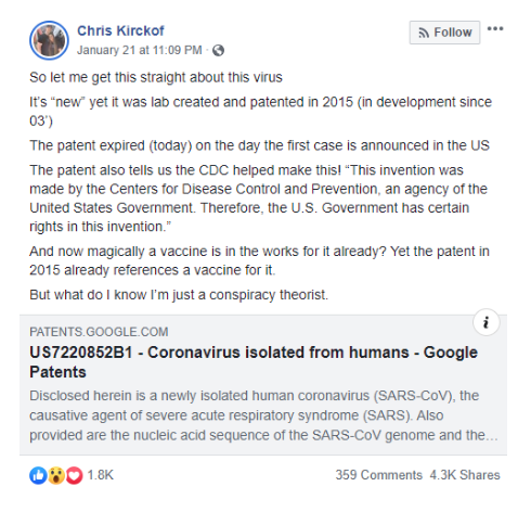 <p>While the spread of Coronavirus in China has been creating global panic, a conspiracy theory suggesting involvement of the US in creation of the virus has also been doing the rounds on social media. However, is the conspiracy theory correct? The answer seems to be in negative.</p>.<p>A Facebook post has been going viral that claims that the recent Coronavirus discovered in China's Wuhan was "lab created and patented in 2015" by CDC, the leading US public health agency. The conspiracy theory alleges that the US created and patented the virus to make profits by selling the vaccine. Several other tweets and posts on the same line are also being made on social media.</p>.<p>However, the allegations are apparently untrue. According to AFP Fact Check, the conspiracy theory has been created on the assumption that there is only one coronavirus, whereas, there are multiple types of the fatal virus.</p>.<p>The report stated that the patent, which is mentioned in the post, is linked with the SARS coronavirus that had arisen in 2002-2003 in China. The SARS coronavirus had caused havoc across the globe, affecting 8.000 people and causing around 900 deaths. The new virus has similarity with the SARS but they are not exactly the same.</p>.<p>“This is a patent covering the sequence of the 2003 SARS-CoV which differs by 25 percent as compared to the Wuhan CoV,” AFP quoted Ralph Baric, a specialist in coronaviruses at the University of North Carolina’s Gillings School of Global Public Health as confirming.</p>.<p>Meanwhile, the Wuhan virus has already claimed 26 lives across China, focing the Chinese authorities to quarantine 41 million people. There are reports of the coronavirus reaching various parts of the globe including the US, France and Australia.</p>
