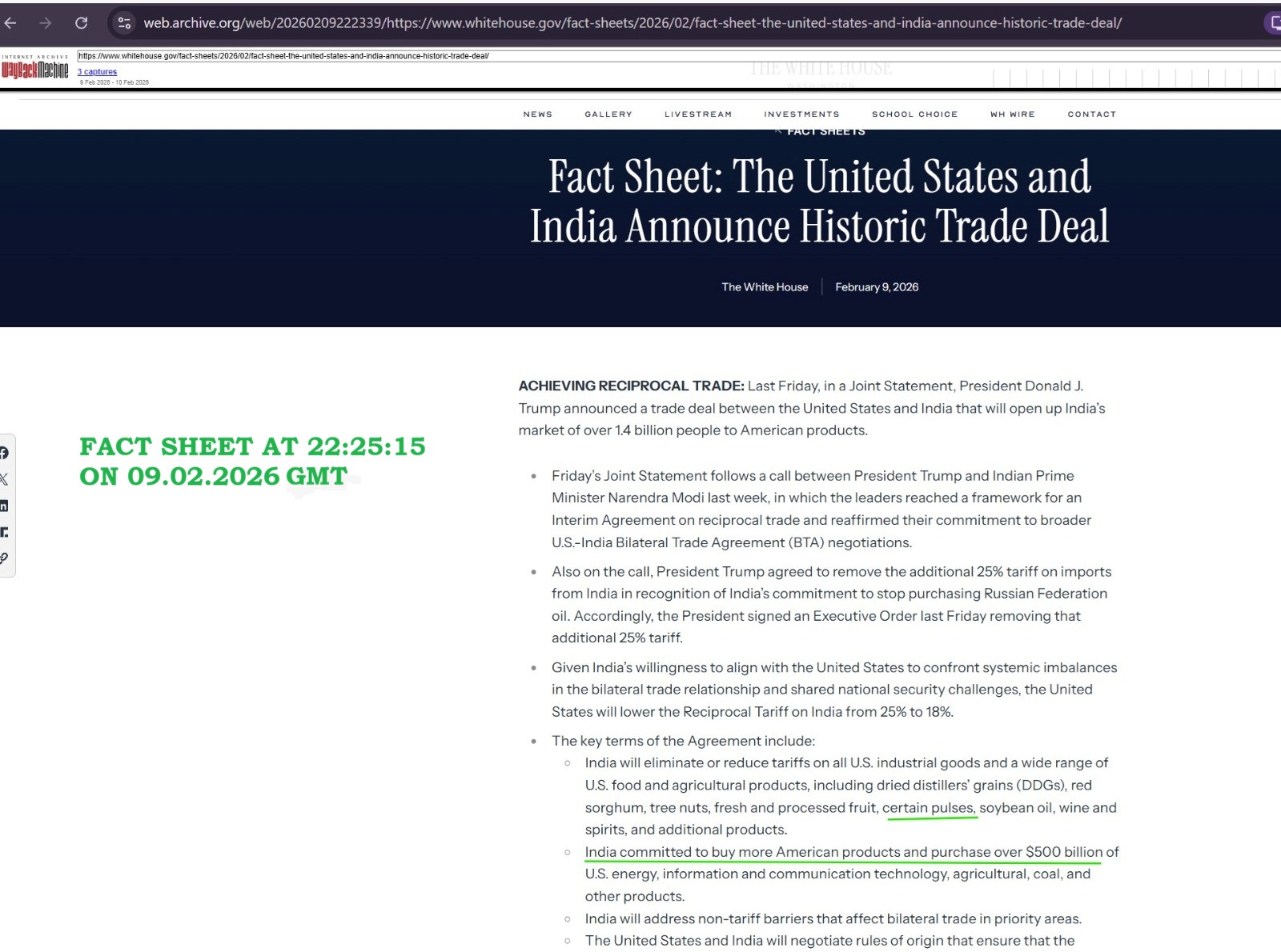 <p>The White House revised its factsheet providing key information of the "historic" <a href="https://www.deccanherald.com/search?q=trade%20deal">trade deal</a> between India and the US. </p><p>In the updated version, the fact sheet has removed the claim saying India would reduce tariffs on "certain <a href="https://www.deccanherald.com/search?q=Pulses">pulses</a>", while also changing the verbatim relating to the $500 billion purchase "commitment". </p><p>This is a significant revision, given that agricultural import is a sensitive area for India's farm sector. </p>.Rollback of 25% punitive tariff on India’s commitment to stop purchasing Russian oil, White House reiterates.<p>The fact sheet released on Tuesday had mentioned "certain pulses" among the products for which India would reduce or eliminate tariffs. </p><p>"India will eliminate or reduce tariffs on all US industrial goods and a wide range of US food and agricultural products, including dried distillers' grains (DDGs), red sorghum, tree nuts, fresh and processed fruit, certain pulses, soybean oil, wine and spirits, and additional products," the statement read. </p>.<p>However, the updated version has deleted the word "pulses", while reading "India will eliminate or reduce tariffs on all US industrial goods and a wide range of US food and agricultural products, including dried distillers' grains (DDGs), red sorghum, tree nuts, fresh and processed fruit, soybean oil, wine and spirits, and additional products."</p><p>India is the world's largest producer and consumer of pulses, including lentils, chickpeas, and dry beans. </p><p>The country has set high tariffs on American and other imports in this category to protect Indian farmers. </p><p>In another major change, the earlier version of the factsheet mentioned that “India will remove its digital services taxes” and had committed to negotiating a robust set of bilateral digital trade rules to address discriminatory or burdensome practices and other barriers to digital trade.</p><p>The revised version, however, makes no reference to the removal of digital services taxes. It now says that India has committed to negotiating bilateral digital trade rules aimed at addressing barriers, without mentioning the removal of the taxes.</p>